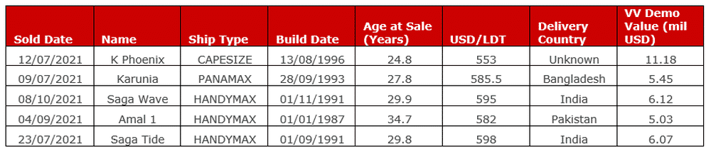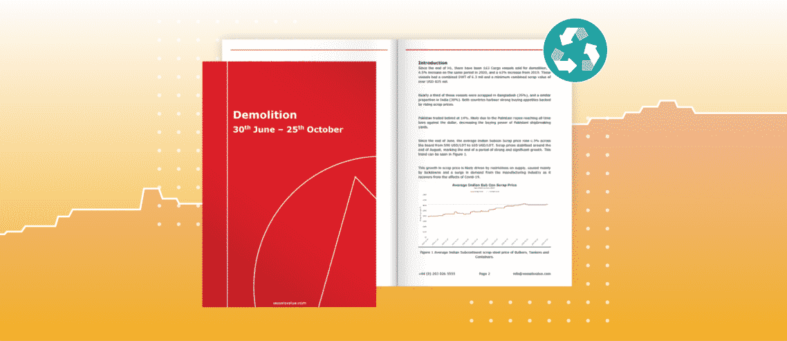 Since the end of H1, there have been 163 cargo vessels sold for demolition, a 4.5% increase on the same period in 2020 when 145 vessels were scrapped, and a 63% increase from 2019 when only 100 vessels were scrapped. These vessels had a combined DWT of 6.3 mil and a minimum combined scrap value of over USD 825 mil.