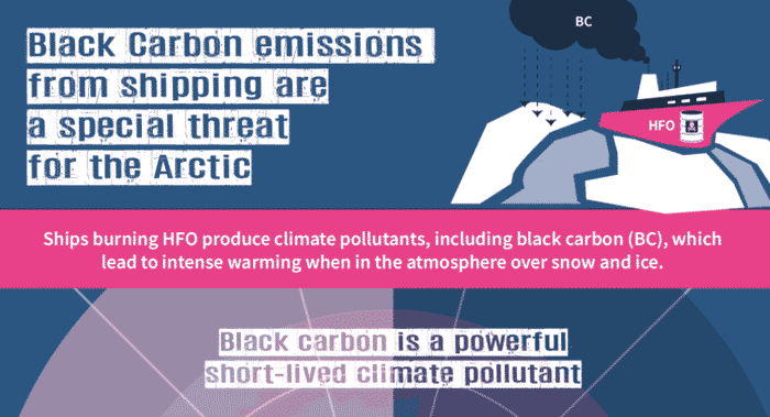 When ships burn HFO, they produce black carbon particles, which are emitted into the environment via their exhaust fumes. These short-lived climate forcers contribute to the warming of the Earth’s atmosphere and when they fall on snow, or on glacier ice and sea ice, their warming impact is 7-10 times greater than on land, as the reflectivity (albedo) is reduced, and consequently the absorption of heat increases. About 7-21% of global shipping’s climate warming impacts can be attributed to black carbon – the remainder being CO2. Black carbon emissions from shipping have already increased by 85% between 2015 and 2019, and more Arctic shipping using HFO will lead to further increases in black carbon emissions, fueling an already accelerating feedback loop. The IMO’s HFO ban will only reduce the volume of black carbon emissions by a mere 5% when it enters into force in July 2024.