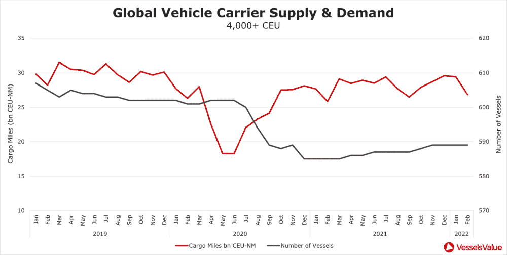 Shipowners follow production forecasts closely as it has proved to be an excellent metric to predict future demand on PCTCs. In recent years, c.18% of annual production has been shipped on Vehicle Carriers. Latest forecasts for 2022 suggest an extra c.1.3 million cars will be exported on deepsea services. Again, this is bullish.