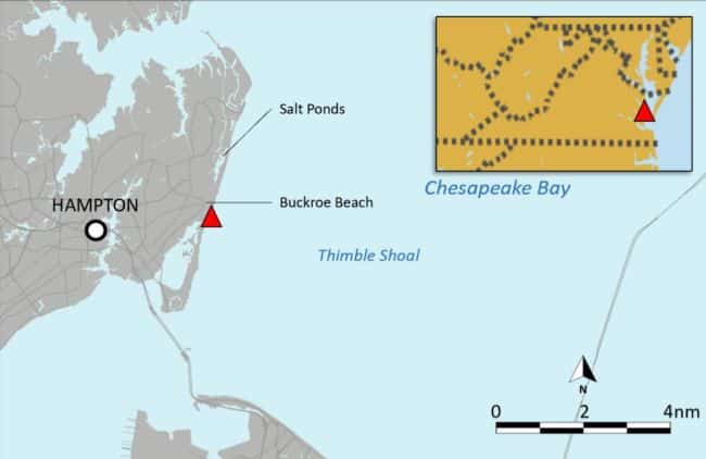 The shoal waters offshore of Buckroe Beach are referred to as “the Horseshoe” and have a heavy concentration of fishing traps. A privately maintained channel runs through the traps to the Salt Ponds.