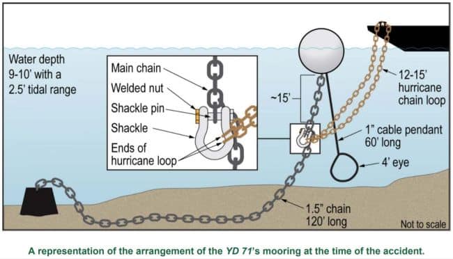 The hurricane loop was shackled to the bottom chain 15 feet below the mooring ball. The shackle’s crown was passed through each bitter end of the hurricane loop. The shackle pin was passed through a link at the bottom chain with the center stud removed and held in place with a nut. The nut was welded to the shackle pin, all the way around to keep it from backing out.