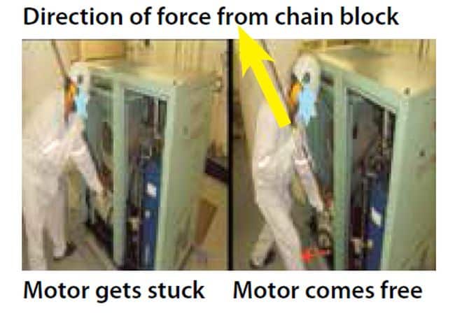 The crew were tasked with removing an air compressor motor from its enclosing cabinet. Because working space around and in front of the the cabinet