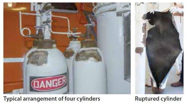 Maintenance was being undertaken on a passenger ship lifeboat while the vessel was in port. One of the four nitrogen cylinders of the ‘stored energy