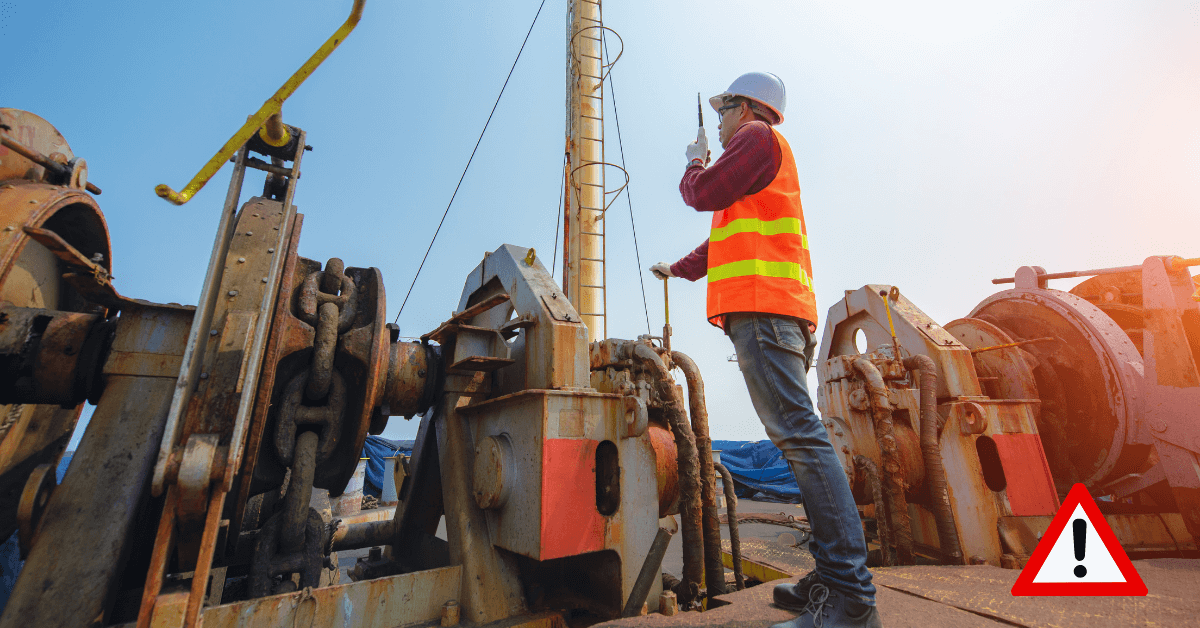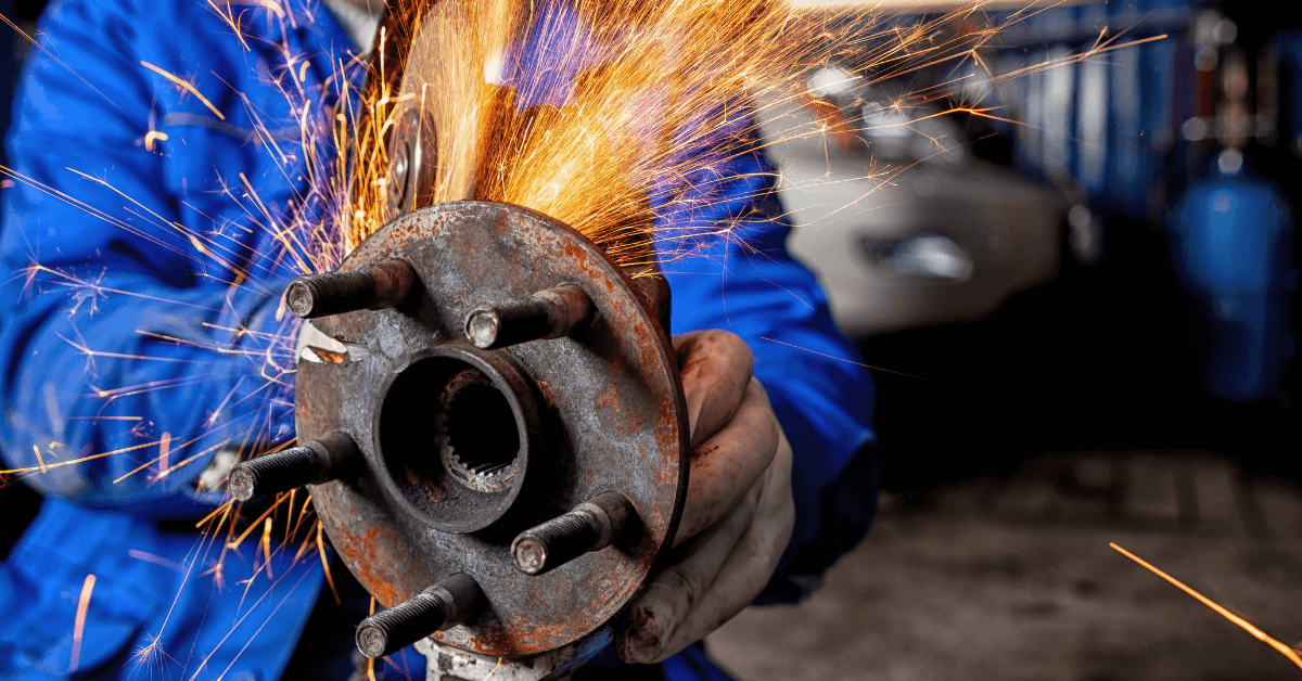 The crew member in the photograph is seen operating a handheld grinder, yet he is not wearing any eye protection. Grinding work throws off metal