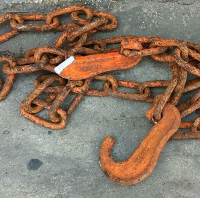Stevedores were securing containers on board a vessel with chain slings. During the securing of one container, the chain broke at the hook and hit