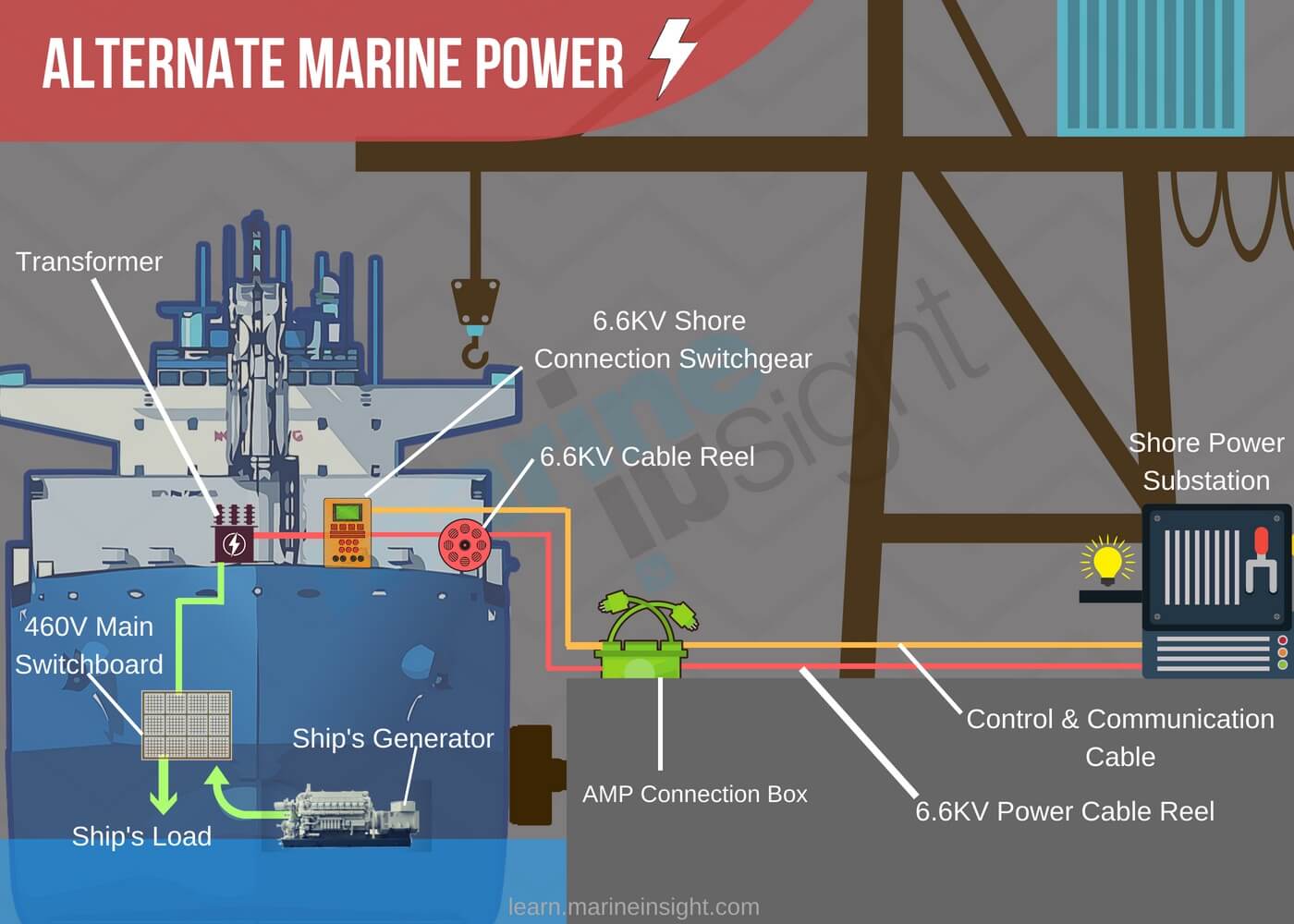 Alternate Maritime Power or AMP is an anti-pollution measure which helps in reducing air pollution generated from diesel generators by using shore electric power as