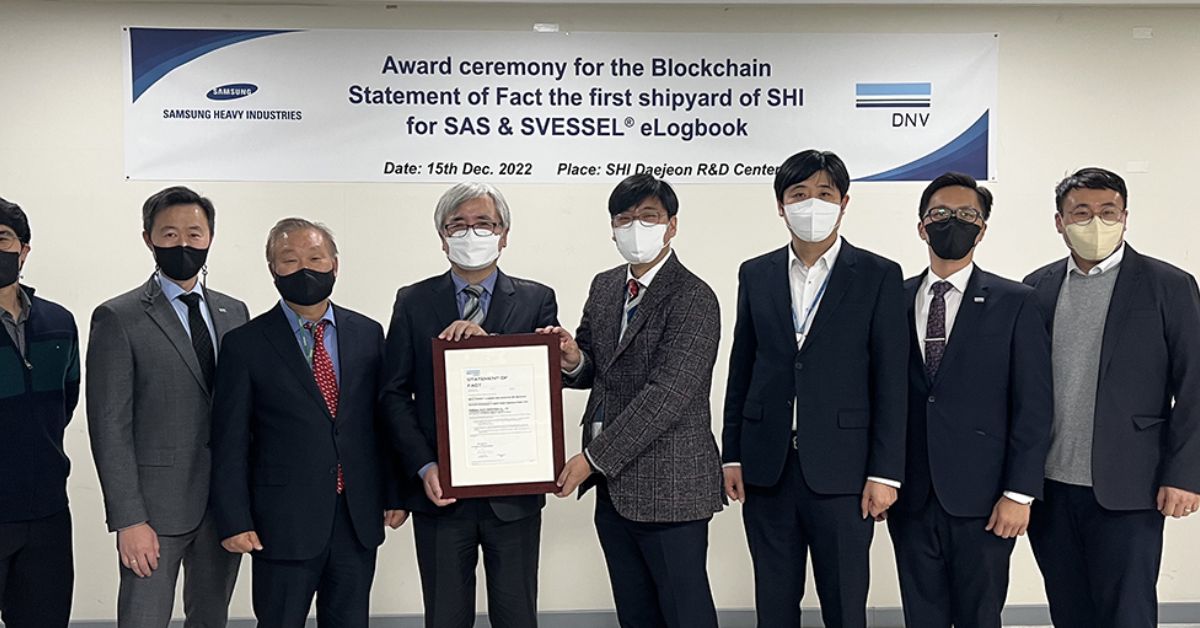 In the first of its kind for a shipyard, DNV has awarded a Statement of Fact (SoF) to Samsung Heavy Industries (SHI) for applying blockchain