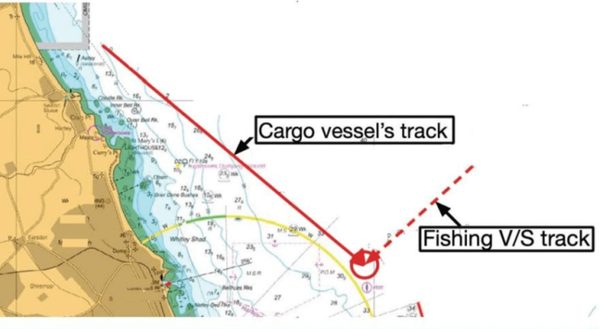 A small general cargo ship left port in the mid-afternoon in foggy conditions. After the pilot disembarked, the Master set the autopilot to steer 129°,