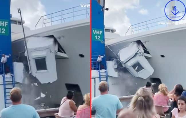 The Bridge Operator was lucky he wasn’t inside the operator’s shack, as the 238-foot yacht ripped the shack clean off the bridge. Image Credits: Haulover