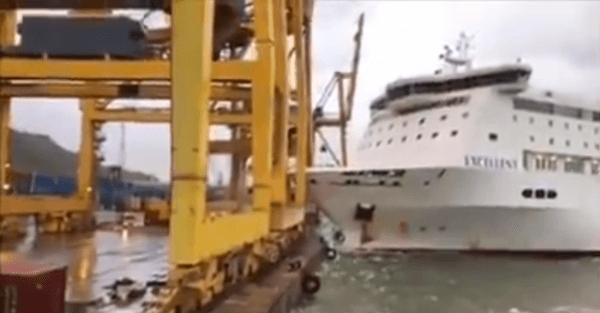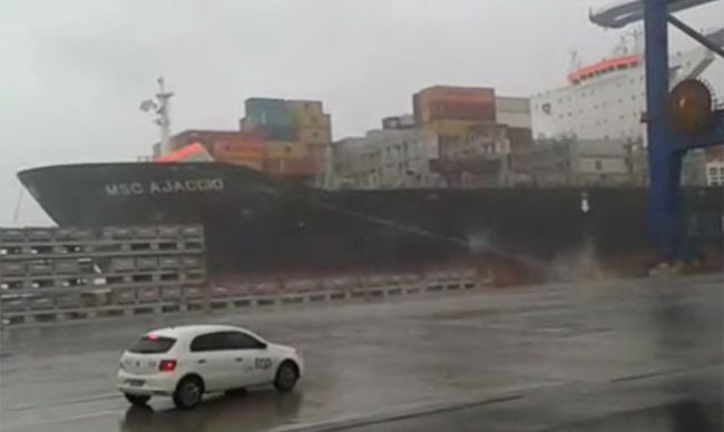 Strong winds lead to breaking of moorings of container ship MSC AJACCIO at Paranagua port, Brazil. The ship initially started drifting in the harbour but