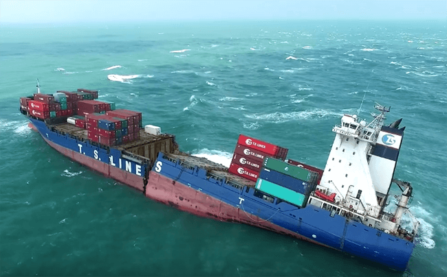The Taiwanese cargo ship S.S. Taipei ran aground off the coast of Taiwan recently broke apart and became stranded on a reef near Shihmen in