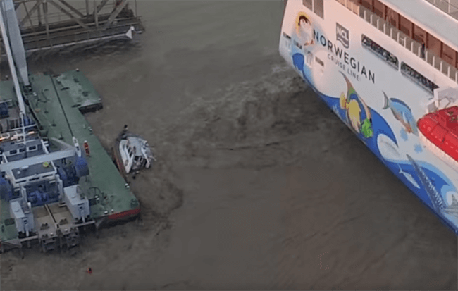 Watch this raw video of a tug boat being pushed under water by the cruise ship Norwegian Escape during its conveyance process. The drone footage