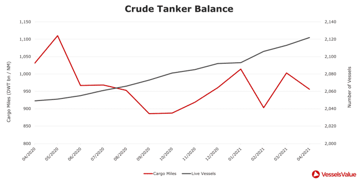 This year, crude Tanker cargo miles stayed consistent between January 2021 and March 2021, until they took another blow in mid-April when cargo miles fell again to 30.68 DWT bn-NM. This was 9% lower than cargo miles at the same time in April 2020, when Tanker rates were soaring due to a contango oil market and around 10% of the dirty Tanker fleet was being used as floating storage.