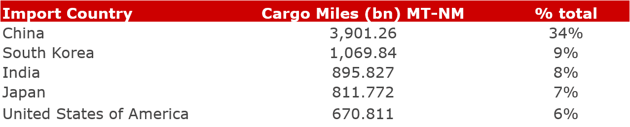 Hopes are that global oil demand must pick up at some point, but these hopes are further threatened by the resurgence of COVIDoutbreaks in some countries, especially India. India is a significant importer of crude oil, ranking third place for the highest cargo miles in the past year. Global cargo miles into India grew by an impressive 81% between the end of November and mid-December 2020, as the number of COVID cases had declined. Since then, between mid-December and May 2021, cargo miles have fallen again by a further 20%, as the number of Covid cases has surged in recent months. Figure 3 shows the top 5 dirty Tanker destinations in the past year.