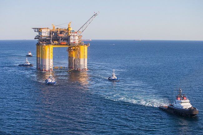 The Ocean Sun, Ocean Sky and two third-party anchor-handling tugs safely towed the Stampede hull for four days before reaching the project site.
