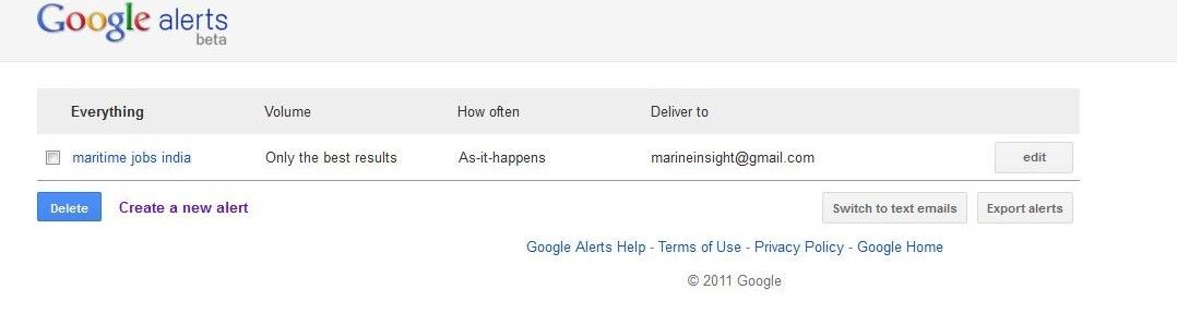 Google Alerts is a useful tool not only to keep a track of various maritime jobs on the internet, but is also a great way to keep oneself updated with the latest maritime trends and news.