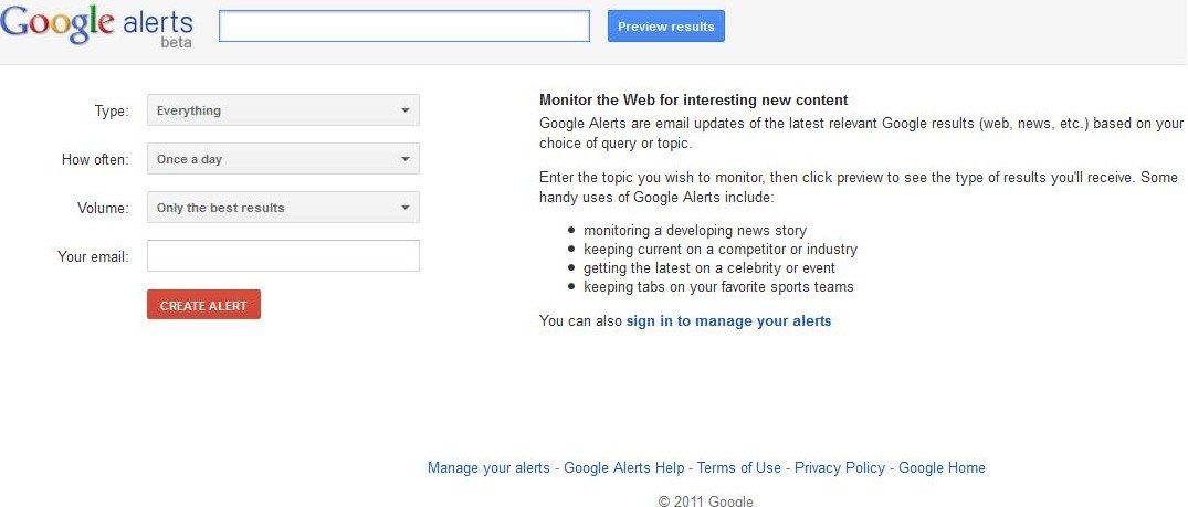 1. First and foremost thing you would need to set up google alert service is a gmail account. If you don’t have one, make one here – Free Gmail Account