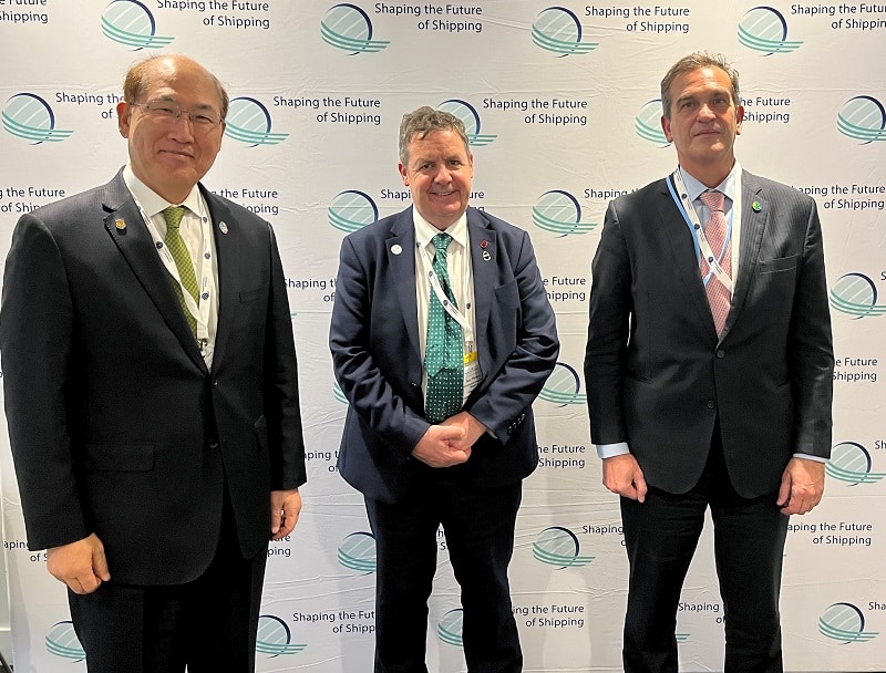 Left to right – IMO Secretary-General, Kitack Lim, ICS Secretary General, Guy Platten and Javier Manzanares, Deputy Executive Director of the Green Climate Fund, meeting in the margins of the Shaping the Future of Shipping conference in Glasgow at COP26 | Photo credit: ICS