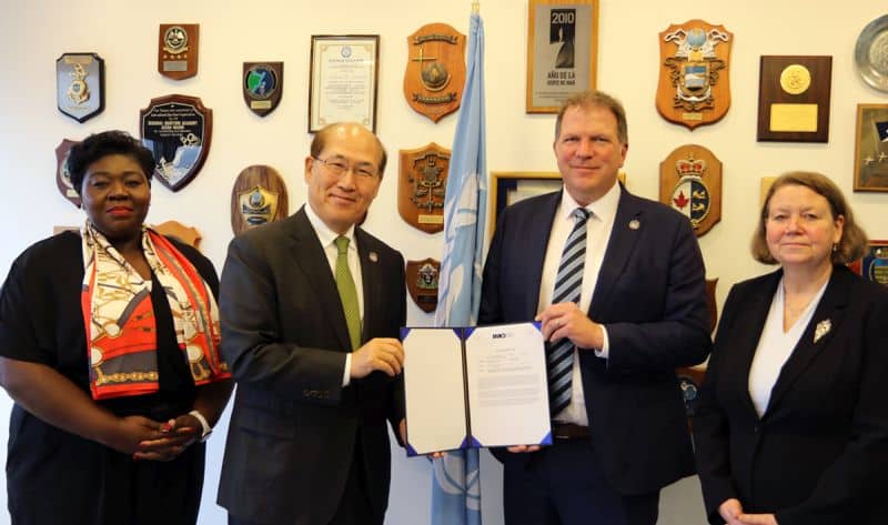 Pictured (from left): Mrs. Azara A. Prempeh, Chief of Staff, Executive Office of the IMO Secretary-General; IMO Secretary-General Kitack Lim; Mr. Peter Adams (as above); and Ms. Heike Deggim, Director, Maritime Safety Division.