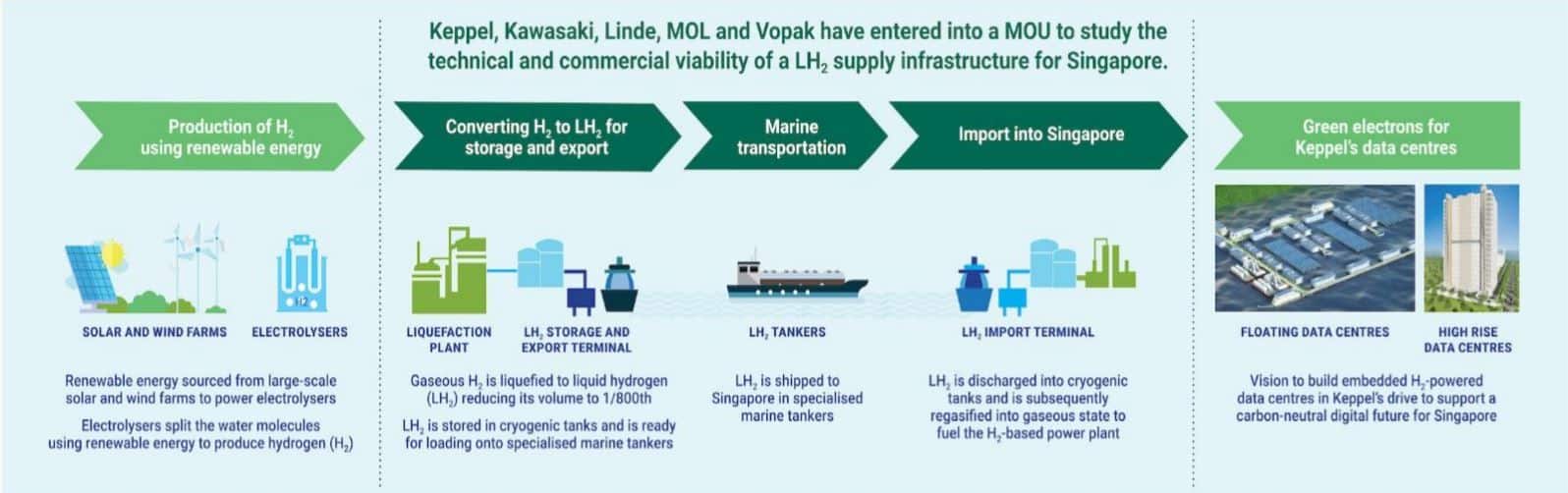 Keppel Data Centres Holdings Pte Ltd (Keppel Data Centres), Kawasaki Heavy Industries, Ltd. (Kawasaki), Linde Gas Singapore Pte Ltd (Linde), Mitsui O.S.K. Lines, Ltd (MOL) and Vopak LNG Holding B.V (Vopak LNG) have entered into a Memorandum of Understanding (MOU) to jointly explore the concept development of a supply infrastructure to bring liquefied hydrogen (LH2) into Singapore to power Keppel’s data centres.