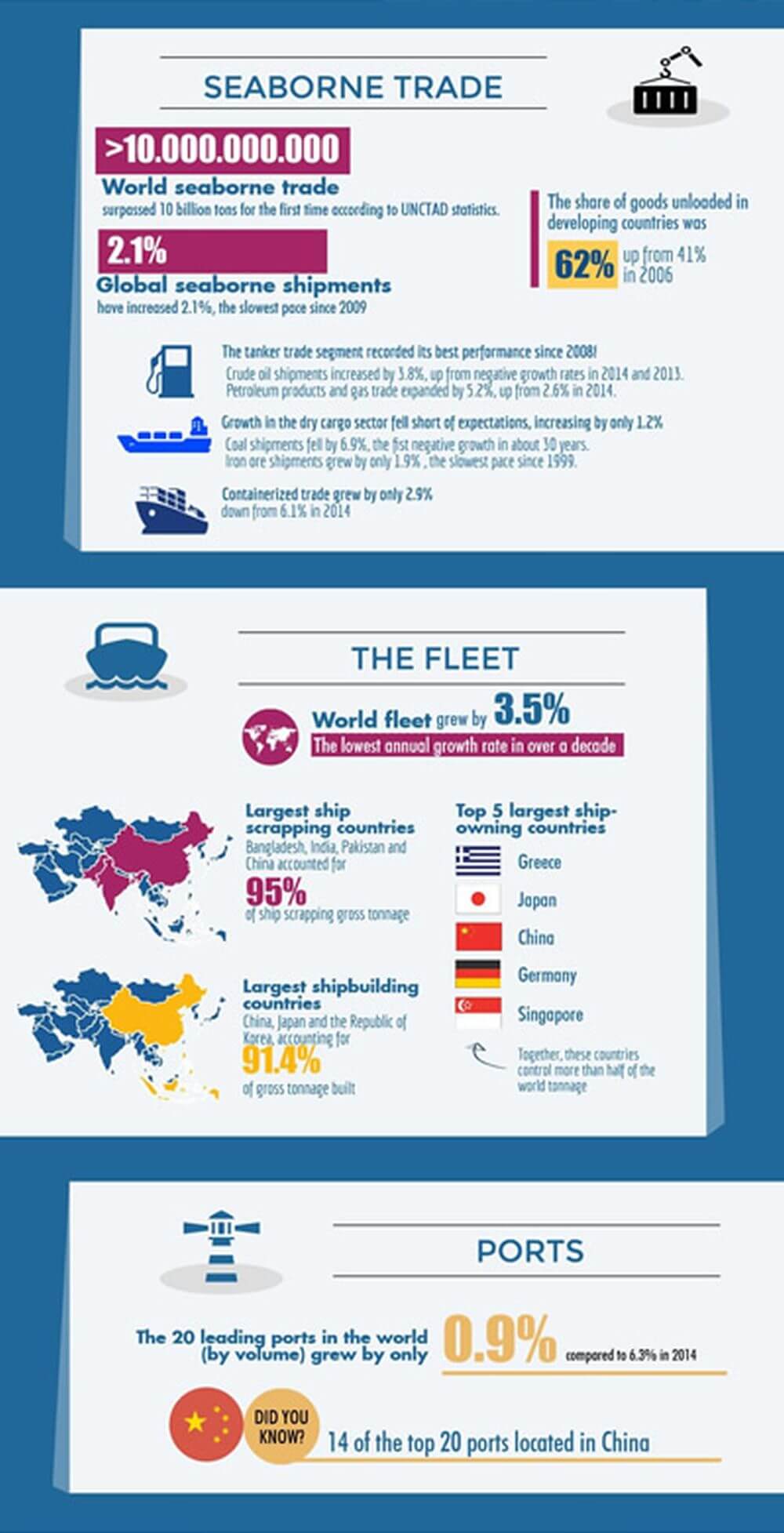 In 2015, estimated world seaborne trade volumes surpassed 10 billion tons – the first time in the records of UNCTAD. Shipments expanded by 2.1 per cent, a pace notably slower than the historical average. The tanker trade segment recorded its best performance since 2008, while growth in the dry cargo sector, including bulk commodities and containerized trade in commodities, fell short of expectations. While a slowdown in China is bad news for shipping, other countries have the potential to drive further growth. South-South trade is gaining momentum, and planned initiatives such as the One Belt, One Road Initiative and the Partnership for Quality Infrastructure, as well as the expanded Panama Canal and Suez Canal, all have the potential to affect seaborne trade, reshape world shipping networks and generate business opportunities. In parallel, trends such as the fourth industrial revolution, big data and electronic commerce are unfolding, and entail both challenges and opportunities for countries and maritime transport.