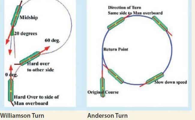 Editor’s note: The Williamson turn is especially useful in reduced visibility as it brings the vessel back on a reciprocal course and into its own wake. However, with good visibility the Anderson turn should be employed as it is a quicker turn.