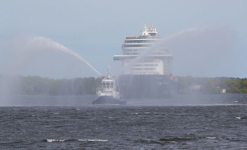The first, and long-awaited, cruise ship call into Stockholm was on 25th May. The cruise ship Mein Schiff 1 arrived at a city centre quay at two o’clock on Tuesday, escorted by tugboats spraying water jets to celebrate her arrival.