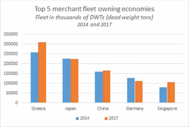 Top 5 ship owners are Greece, Japan, China, Germany and Singapore. Together they have a market share of 49.5% of dwt. Only one country from Latin America (Brazil) is among the top 35 ship owning countries, and none from Africa.