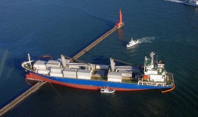 A massive container ship collided with a breakwater at Japan’s Hakata port. As a result, the bow of the ship rode up and got stuck.