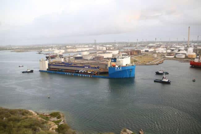 The unloading in Santa Anna Bay was also delayed due to strong winds which initially prevented the safe passage of the 98,000 DWT Xin Guang Hua under the Queen Juliana bridge, much to the disappointment of the assembled citizens of the city of Willemstad. It finally took place at 0530 the following morning, to much smaller but still enthusiastic crowds. The actual floating-off of the docks went smoothly the following day and they are now alongside the repair quay at DSCu.