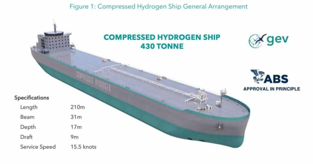 Extract from the AIP: ABS has reviewed GEV’s design in accordance with the 2020 ABS Guide for Vessels Intended to Carry Compressed Natural Gases in Bulk, 2021 ABS Guide for Liquified Gas Carriers with Independent Tanks, 2017 ABS Guidance Notes on Review and Approval of Novel Concepts, 2017 ABS Guidance Notes on Qualifying New Technologies, 2021 ABS Marine Vessel Rules, 2016 IMO IGF Code and 2016 IMO IGC Code, and considers that the proposed conceptual design for the 430 tonnes Compressed Hydrogen Carrier is feasible.